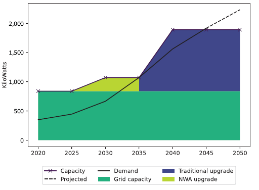 研究團隊采用的靈活估值框架產(chǎn)生的結果取決于技術成本假設(例如電網(wǎng)升級成本、電池儲能系統(tǒng)的資本成本)和需求增長預測。電池儲能系統(tǒng)可以推遲電網(wǎng)其他投資的時間框架可能遠遠低于其有效的使用壽命。因此,有必要評估多個投資期的靈活框架。