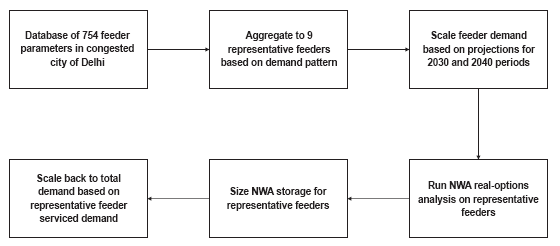 此外,研究團隊根據(jù)各自的服務需求以及與德里這些支線可用的電力線路長度之比,估計了九個支線中的每一個在其他特大城市中所代表的線路長度。靈活的估值框架適用于每個特大城市的每個代表性支線,其方法是使用需求側模型中的適當增長率來預測2030年和2040年的各種需求。電網(wǎng)投資成本是根據(jù)每個特大城市中每個代表性饋線的電力線路長度計算的。代表性饋線的最終分布式儲能系統(tǒng) (DLS)容量使用每個饋線的服務需求與代表需求的比率來衡量。