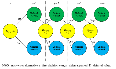 對于分布式儲能系統(tǒng) (DLS),研究團隊根據(jù)儲能系統(tǒng)規(guī)模計算年化固定成本(圖7.6,步驟2)。其靈活性的實物期權價值包括傳統(tǒng)電網(wǎng)升級所需投資與儲能系統(tǒng)所需投資之間的差額;這就是延遲電網(wǎng)升級的價值。研究團隊使用年化投資成本進行所有計算,以便可以按順序考慮多次延期,并且當靈活性的實物期權價值不再有利時,研究團隊會考慮電池儲能系統(tǒng)的殘值。在圖7.7中,D是指延遲值,它通過計算預期成本來計算,定義為MCMC概率與其對象成本的乘積之和。如果D<0,則延遲電網(wǎng)升級的儲能預期成本低于傳統(tǒng)網(wǎng)絡升級的預期成本,因此儲能具有非負NWA值。在每個決策點p重復該過程,并具有相應的成本、預測和概率(圖7.7)。