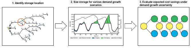 圖 7.6 總結了研究團隊方法的三個步驟。首先,研究團隊確定最佳的儲能部署地點以減輕配電網(wǎng)絡的過載。電網(wǎng)擁塞主要發(fā)生在電力需求峰值期間,因為電力需求也很高,這意味著電網(wǎng)也在同時超載?;谠谧钌贁?shù)量的地理位置提供對電力線路的最大需求緩解來確定儲能部署的最佳位置。其次,研究團隊根據(jù)負載曲線和網(wǎng)絡組件的過熱限制,針對給定的需求場景評估確定位置的電池儲能系統(tǒng)的成本進行優(yōu)化。使用時間序列線性程序來調整儲能系統(tǒng)的規(guī)模以適應各種需求增長情景。這些優(yōu)化確定要部署的電池儲能容量,從中研究團隊推斷出分布式儲能系統(tǒng) (DLS)的資本和運營成本。