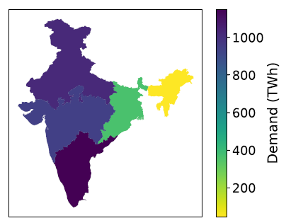 這些運行限制是從基于2015年天氣模式的單年負荷數(shù)據(jù)中選擇的20多個具有代表性的電網(wǎng)運行周建模,并通過聚類技術開發(fā)了可再生能源和水電資源配置文件。研究團隊使用由電網(wǎng)運營商(印度中央電力局2017年)定義的五個獨立的平衡區(qū)域(北部、西部、南部、東部和東北部)代表印度電網(wǎng),并根據(jù)上述情況為每個投資期開發(fā)特定區(qū)域的負載配置文件,這描述了需求預測模型。這些區(qū)域之間的電力流動基于簡化的網(wǎng)絡表示進行建模,該電網(wǎng)表示強制執(zhí)行區(qū)域之間的電力交換限制。對于2020年,這些功率限制來自系統(tǒng)運營商;而在未來,這些限制可能會隨著額外的輸電投資而擴大。