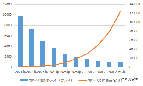 圖片據(jù)行業(yè)內(nèi)一家代表性的系統(tǒng)公司稱,從2016年到2018年,燃料電池價(jià)格大約2萬元/kW,從2019年-2021年降到1萬元/kW,從2022年到未來兩年降到5000元/kW。顯然,這個(gè)節(jié)奏與我們預(yù)期的模型基本吻合。