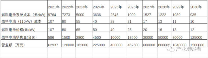 我們以億華通和重塑兩家6億以上銷售額的公司為例,補(bǔ)貼期間,燃料電池銷售價(jià)格可以高于成本,享受部分補(bǔ)貼紅利,到2026年預(yù)計(jì)補(bǔ)貼不會(huì)戛然而止,但補(bǔ)貼幅度會(huì)大幅下降,這時(shí)候燃料電池銷售價(jià)格將有較大幅度的下降,以保住市場(chǎng)的銷量,并使得營業(yè)額不至于下降。