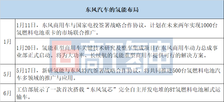 東風(fēng)汽車致力于打造氫能源汽車整條研發(fā)鏈,堅持自主開發(fā),從基礎(chǔ)材料到核心部件、雙極板、膜電極、電堆、系統(tǒng)集成,以及整車應(yīng)用,建立了先進的實驗室和中試的生產(chǎn)能力。今年上半年布局事件如下: