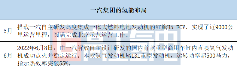 一汽解放作為“國車長子”,經(jīng)過六十多年的發(fā)展,已成為國內(nèi)最大的汽車企業(yè)集團之一,曾連續(xù)8年蟬聯(lián)世界500強榜單。在塑造新紅旗品牌時提出要直接切入新能源賽道,其以氫氣為主要動力能源的“氫贏計劃”,計劃到2030年,實現(xiàn)氫燃料電池產(chǎn)品商業(yè)化、分布式驅(qū)動技術(shù)產(chǎn)業(yè)化,新能源車銷量占比達到60%。今年上半年布局事件如下: