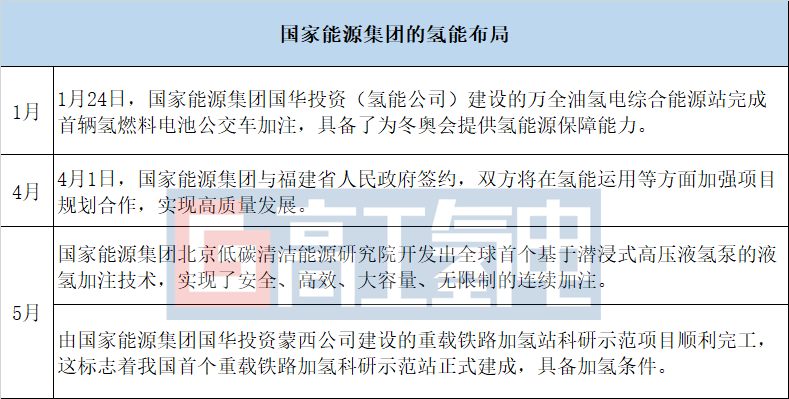 國家能源集團在氫能源產(chǎn)業(yè)有著得天獨厚的優(yōu)勢,提出了“技術(shù)儲備、項目示范、對外合作”發(fā)展思路,有序培育氫能等戰(zhàn)略性新興產(chǎn)業(yè),目前該公司正在加快布局從制氫到加氫站的氫能利用全產(chǎn)業(yè)鏈。今年上半年布局事件如下: