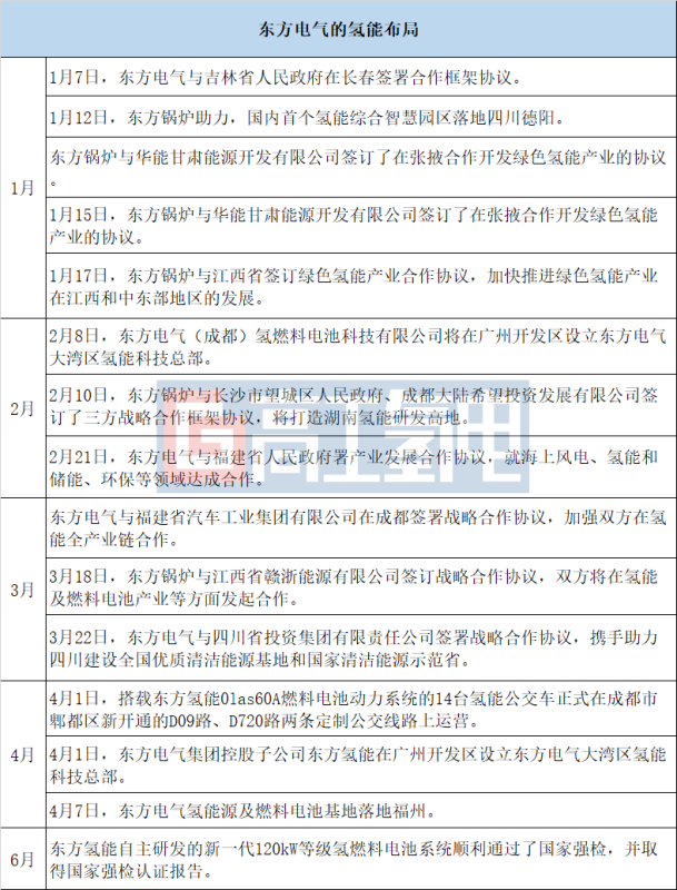 作為央企,東方電氣從2010年就開始布局氫能,經(jīng)過十多年的努力,已掌握了燃料電池關(guān)鍵核心技術(shù),形成了氫制取、氫儲存、氫加注、氫使用全產(chǎn)業(yè)鏈整體解決方案的供應(yīng)能力。東方氫能與東方鍋爐是集團運營氫能業(yè)務(wù)的兩大主體,合力支撐東方電氣的氫能戰(zhàn)略發(fā)展。今年上半年布局事件如下: