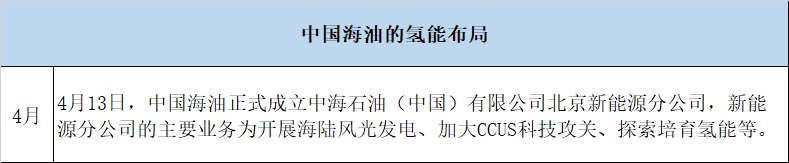 中國海油在布局氫能領(lǐng)域注重融合協(xié)同,加快發(fā)展海上風(fēng)電,擇優(yōu)發(fā)展陸上風(fēng)光,因地制宜發(fā)展氫能業(yè)務(wù),探索發(fā)展多能互補綜合能源供應(yīng)系統(tǒng),正在努力實現(xiàn)中國海油“十四五”末新能源新產(chǎn)業(yè)收入占比達到10%的目標(biāo)。今年上半年布局事件如下: