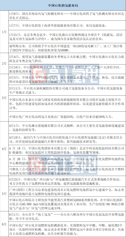 中石化是國內(nèi)能源巨頭,在國家能源戰(zhàn)略轉(zhuǎn)型背景下,中石化對氫能產(chǎn)業(yè)也進行了全面的布局,并提出了成為“中國第一氫能公司”的目標(biāo)。中石化在“十四五”期間的發(fā)展目標(biāo)是建設(shè)全國最大的加氫站網(wǎng)絡(luò)、可再生能源制氫產(chǎn)量累計超百萬噸,同時聚焦氫能交通領(lǐng)域和綠氫煉化。今年上半年布局事件如下: