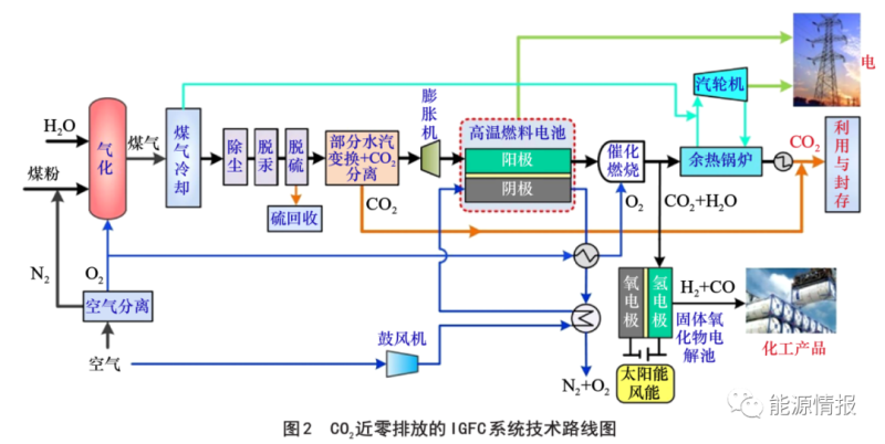 隨著我國(guó)能源形勢(shì)日益嚴(yán)峻及環(huán)保壓力持續(xù)加大,對(duì)降低CO2排放、實(shí)現(xiàn)煤炭資源清潔高效利用的需求越來(lái)越迫切,煤炭清潔高效利用技術(shù)創(chuàng)新是我國(guó)《能源技術(shù)革命創(chuàng)新行動(dòng)計(jì)劃(2016—2030 年)》的重要內(nèi)容。在整體煤氣化聯(lián)合循環(huán)發(fā)電的基礎(chǔ)上發(fā)展的煤氣化燃料電池發(fā)電技術(shù),可實(shí)現(xiàn)煤基發(fā)電由單純熱力循環(huán)發(fā)電向電化學(xué)和熱力循環(huán)復(fù)合發(fā)電的技術(shù)跨越,大幅提高煤電效率,在高效發(fā)電的同時(shí)實(shí)現(xiàn)污染物近零排放和負(fù)荷快速響應(yīng),被視作未來(lái)最有發(fā)展前景的近零排放煤氣化發(fā)電技術(shù)。國(guó)家《“十三五”國(guó)家科技創(chuàng)新規(guī)劃》和《能源技術(shù)革命創(chuàng)新行動(dòng)計(jì)劃(2016—2030 年)》等都將 IGCC/IGFC 列為的重要內(nèi)容和發(fā)展目標(biāo)。2017 年,我國(guó)啟動(dòng)了面向 2030 年重大科技項(xiàng)目,其中明確要求完成基于 IGFC 發(fā)電關(guān)鍵技術(shù)研發(fā)和工程示范。