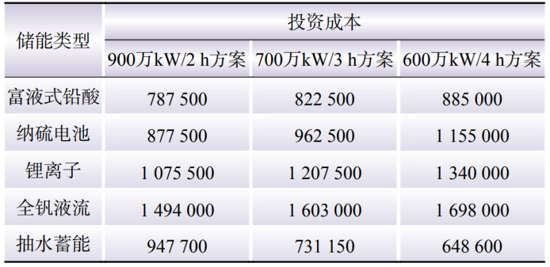 由表9可以看到,由于不同類型的儲能系統(tǒng)的功率成本、能量成本差異較大,造成不同配置方案的投資成本差別較大。對于電化學儲能系統(tǒng)來說,3種配置方案中,最優(yōu)的為鉛酸電池系統(tǒng)的900萬kW/2 h方案;若地理條件允許,抽水蓄能電站的600萬kW/4 h方案更優(yōu)。