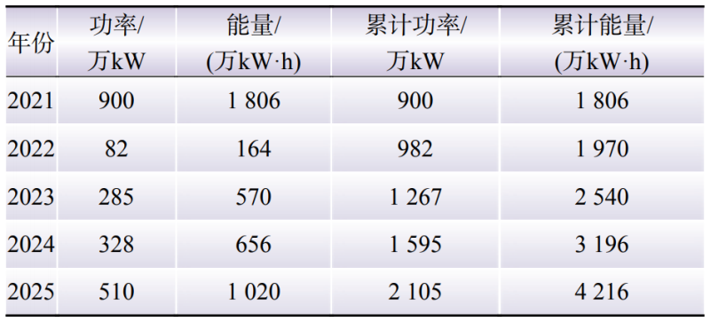 根據上述方法,開展某省級電力系統(tǒng)配置儲能分析計算。根據2021—2025年的邊界條件,考慮該系統(tǒng)中需求響應占比小于1%,以負荷100%滿足和新能源利用率達到95%為目標,開展“十四五”期間逐年配置儲能的分析計算。