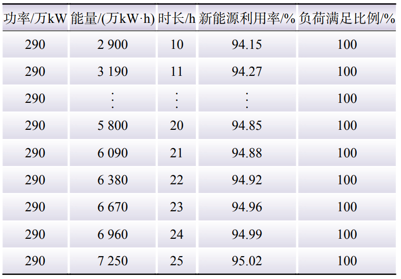 (2)儲能功率初值下的能量計算。在保證電網安全穩(wěn)定運行和供熱要求的前提下,設置儲能功率初值290萬kW,按40%納入機組組合,能量初值為2900萬kW·h,時序仿真計算得到新能源利用率為94.15%,不滿足利用率要求,進一步增加儲能能量,得到功率初值下,滿足負荷和新能源利用率要求的儲能配置方案為290萬kW、7 250萬kW·h,如表3所示。