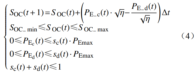 式中:SOC(t) 為時刻t的儲能荷電狀態(tài);PE_c(t) 為時刻t儲能的充電功率;PE_d(t) 為時刻t儲能的放電功率;η 為儲能充放電效率;Δt 為計算時間間隔;SOC_ max 為儲能最大荷電狀態(tài);SOC _ min 為儲能最小荷電狀態(tài);sc(t) 為儲能充電狀態(tài),為0-1變量,0表示不充電,1表示充電;sd(t) 為儲能放電狀態(tài),為0-1變量,0表示不放電,1表示放電;PEmax 為儲能額定功率。