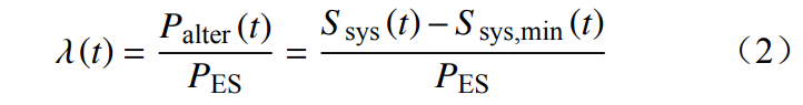 式中:Pue(t) 為儲能納入機組組合后時刻t常規(guī)電源調節(jié)上限;Pu(t) 為時刻t常規(guī)電源調節(jié)范圍上限;Pde(t) 為儲能納入機組組合后時刻t常規(guī)電源調節(jié)范圍下限;Pd(t) 為時刻t常規(guī)電源調節(jié)范圍下限;PES(t) 為時刻t儲能放電功率;λ(t) 為儲能等效置換常規(guī)機組的容量與儲能放電功率的比值;α 為常規(guī)機組最小技術出力與額定容量的比值。