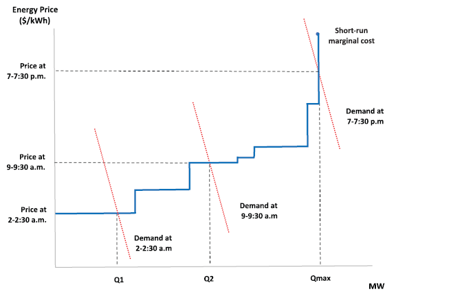 與圖8.1中描述的電力系統(tǒng)相比,該電力系統(tǒng)建立在具有穩(wěn)定邊際成本(反映不同的熱效率和燃料成本)的可調(diào)度發(fā)電設(shè)施之上,可再生能源發(fā)電的供應(yīng)該根據(jù)風(fēng)力和陽光的外生變化而上下波動。因此,不存在圖8.1中描述這樣簡單的經(jīng)濟(jì)調(diào)度曲線。此外,風(fēng)力發(fā)電和太陽能發(fā)電的短期邊際成本始終接近于零。由此類發(fā)電設(shè)施主導(dǎo)的電力市場面臨設(shè)計挑戰(zhàn):如何提供反映生產(chǎn)邊際成本的批發(fā)和零售價格信號,同時仍產(chǎn)生涵蓋投資和運營成本的預(yù)期收入。此外,如第1章和第6章所述,許多儲能技術(shù)的邊際運營成本也接近于零,并且在充電/放電循環(huán)中損失的能量相對較少。因此,這些技術(shù)引發(fā)了類似的市場設(shè)計問題。此外,以可再生能源和儲能技術(shù)為主的電力系統(tǒng)的運行特性,將會引發(fā)了重大的公平和風(fēng)險承受能力問題,這些問題必須在設(shè)計未來的零售定價機(jī)制時加以解決。