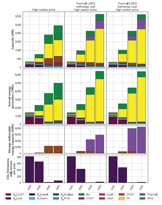 第6章中介紹的美國幾個地區(qū)的模型結(jié)果,以及作為研究團(tuán)隊在本章第7.2.3節(jié)中評估分布式儲能系統(tǒng)影響的一部分討論的低成本鋰離子電池儲能方案,強(qiáng)調(diào)了獲得低成本的鋰離子電池的重要性,從而用于電網(wǎng)脫碳。預(yù)期電池成本的下降趨勢,尤其是長時儲能的成本下降也很重要。在這里,研究團(tuán)隊探討了從2040年開始的長時儲能技術(shù)的可用性如何影響印度電力系統(tǒng)的發(fā)展。在研究團(tuán)隊的分析中,使用熱儲能作為長時儲能的代表技術(shù),并檢查其在不同碳排放政策情景下的作用,包括假設(shè)沒有碳排放政策的參考案例和碳價格從2030年的20美元/噸上漲到接近的情景到2050年的50美元/噸。研究團(tuán)隊還考慮了長時儲能在替代成本和性能假設(shè)下的作用(即中低端成本假設(shè),在2040年和2050年保持不變)。