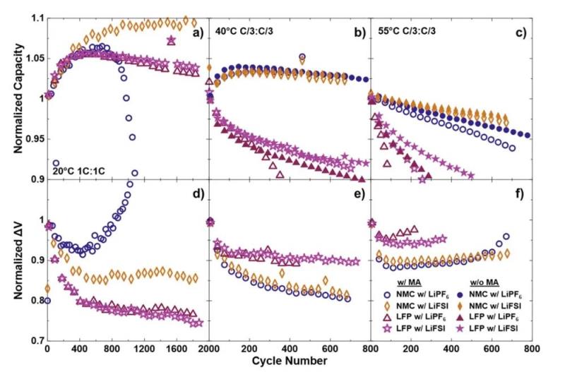 與此同時,更換了新電解液的NMC523電池壽命更長。無論是在氣溫適宜的20-°C條件下,還是嚴酷的40°C、55°C條件下,LiFSI電解質(zhì)鹽的電芯有著更好的壽命表現(xiàn)。尤其在20-°C條件下,電池在充電循環(huán)2000次之后,容量幾乎不會發(fā)生衰減,明顯強于普通NMC532和磷酸鐵鋰電芯。