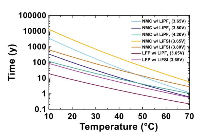 從上文的研究中可以總結(jié),雙氟電池具有更長的壽命。綜合此前測試的數(shù)據(jù)可以繪制出一張溫度與容量下降至80%所需時間的關(guān)系圖,從圖上可以發(fā)現(xiàn),只要溫度在20°C左右,雙氟三元鋰電池使用壽命能夠超過100年。