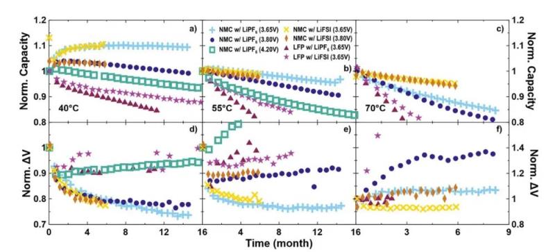 研究人員將電池使用的溫度分為了三個檔位,分別是40°C、55°C和70°C。在三元鋰電池經(jīng)過3000小時、磷酸鐵鋰電池經(jīng)過2000小時的充放電使用后,在測試溫度下對電池進行檢測。檢測項目包括對三元鋰電池的負極進行X射線熒光光譜分析、測量涂層電極的尺寸和重量等項目。
