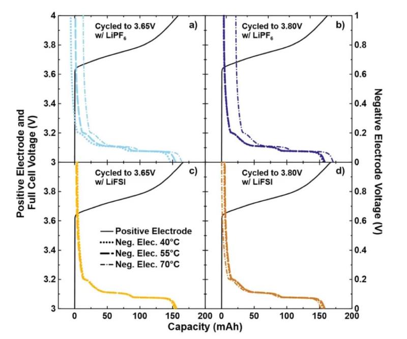 在電芯容量和正、負極電壓關(guān)系的折線圖中也能發(fā)現(xiàn),當(dāng)電池充電至3.65V時,雙氟電池對溫度不敏感,無論是40°C、55°C,還是70°C條件下,溫度對正、負極電壓的影響幾乎為零。但是六氟電池正極電壓隨溫度變化幅度非常明顯。