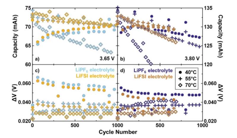當(dāng)溫度達到70°C時,二者就明顯拉開了差距,六氟電池出現(xiàn)了明顯的容量和能量密度下降,但雙氟電池表現(xiàn)依然很強。