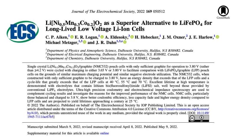 那么,Jeff Dahn及其團隊的研究歷程究竟是怎樣的,除了電解質(zhì)鹽之外,這一新型的電池還有哪些秘密?日前,車東西將《NMC532對比LFP電芯,是長壽命、低壓鋰離子電芯的更好替代》這篇論文進行了全文編譯,在不改變原文事實的基礎(chǔ)上,略有刪減,最終找到了問題的答案。