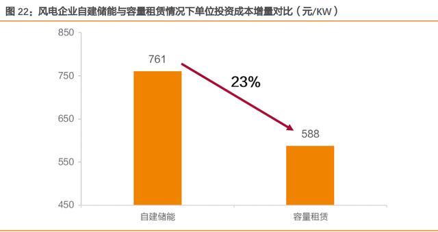 輔助服務(wù)市場放開,獨立儲能是更加貼合政策導(dǎo)向的獨立市場主體。2021 年底新發(fā)布的 “兩個細則”擴大了輔助服務(wù)的提供主體,豐富了輔助服務(wù)的服務(wù)品種,輔助服務(wù)市場向 儲能放開。《“十四五”新型儲能發(fā)展實施方案》中明確提出,要推動儲能作為獨立主體參與各類電力市場,相比傳統(tǒng)依附于發(fā)電側(cè)的商業(yè)模式,獨立儲能電站更加貼合該政策導(dǎo)向。 同時,由于其“獨立性”,該模式下責(zé)任主體更為明確,有利于進一步提高儲能電站發(fā)展 建設(shè)的規(guī)范性與安全性。 同時滿足多方需求,“一站多用”共享模式助力收入渠道擴展。獨立儲能電站除了能夠作為傳統(tǒng)電網(wǎng)側(cè)儲能設(shè)施滿足其調(diào)峰調(diào)頻需求外,還可以滿足發(fā)電側(cè)的儲能需求。2021 年 8 月,國家能源局及發(fā)改委發(fā)布《關(guān)于鼓勵可再生能源發(fā)電企業(yè)自建或購買調(diào)峰能力增加并 網(wǎng)規(guī)模的通知》,確定新能源發(fā)電企業(yè)可通過租賃儲能容量,滿足新增新能源裝機調(diào)峰能力建設(shè)需求。以陸上風(fēng)電為例,根據(jù)測算,相比于自建儲能,發(fā)電企業(yè)選擇租賃儲能容量 時(15%配儲比例),總投資成本可降低 23%左右,差距明顯。