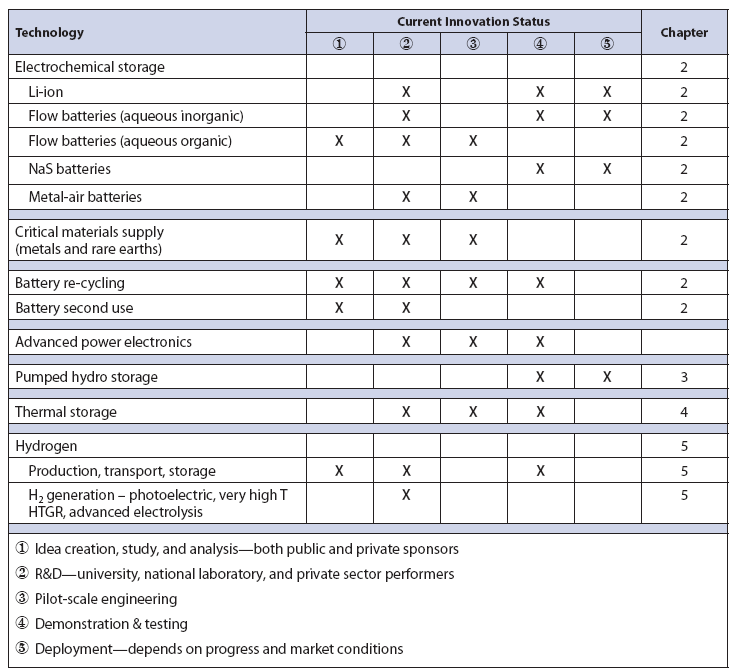 表9.1 麻省理工學院能源倡議(MITEI)關于選定當前創(chuàng)新狀態(tài)的未來儲能研究結果總結