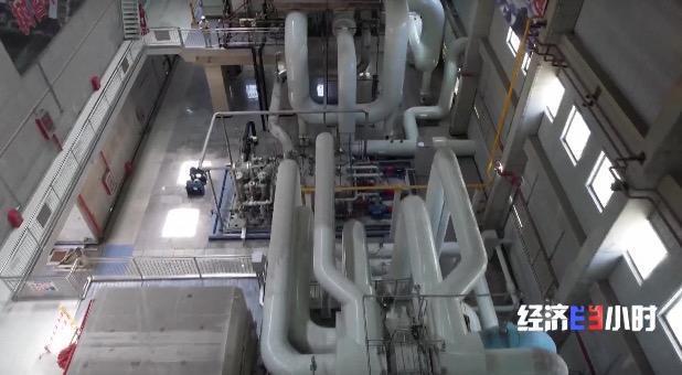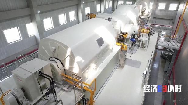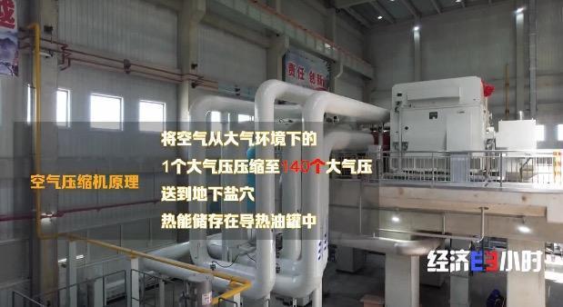 這臺空氣壓縮機的原理有點像我們給輪胎充氣的“打氣筒”,它的作用是將空氣從大氣環(huán)境下的1個大氣壓,壓縮至140個大氣壓,并送到地下鹽穴。產(chǎn)生的熱能儲存在導(dǎo)熱油罐中,持續(xù)8個小時,電站就完成了一個儲能周期。