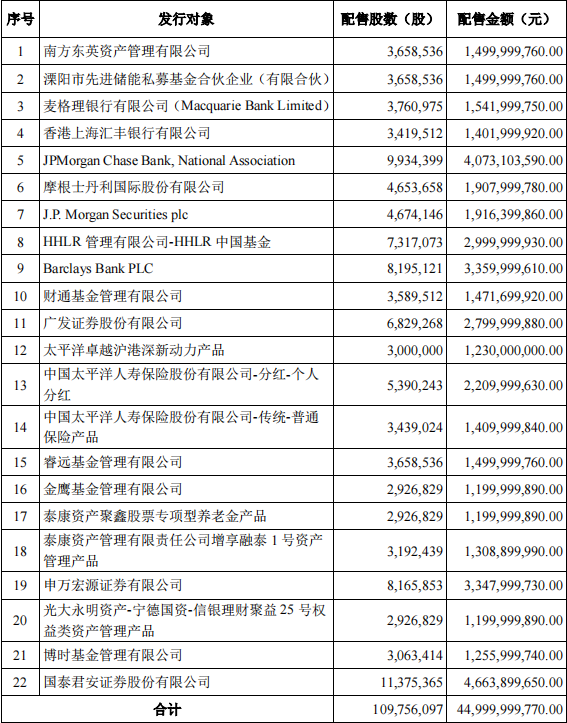 6月22日晚,寧德時代(SZ300750,股價507.00元,市值1.18萬億元)發(fā)布公告稱,本次定增的發(fā)行價格最終為410元/股,共募集資金總額約為450億元,扣除各項發(fā)行費用(不含增值稅)后,實際募集資金凈額人民幣448.7億元。共有22家投資者獲配。其中,國泰君安、J.P.Morgan Chase Bank、Barclays Bank Plc分別以46.6億元、40.7億元和33.6億元排在本次配售金額的前三位。