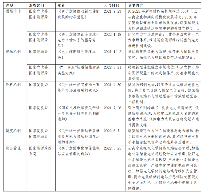 國(guó)家層面從2021年起,陸續(xù)出臺(tái)了一系列綱領(lǐng)性文件,從頂層設(shè)計(jì)、市場(chǎng)機(jī)制、價(jià)格機(jī)制、調(diào)度機(jī)制等方面為新型儲(chǔ)能建設(shè)高速發(fā)展插上“翅膀”。