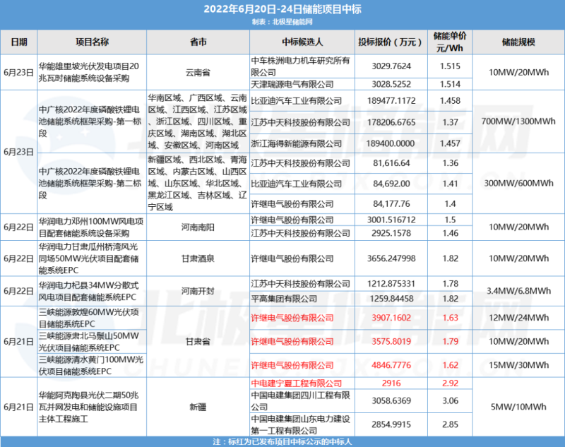 6月23日,中廣核風(fēng)電有限公司發(fā)布2022年度磷酸鐵鋰電池儲(chǔ)能系統(tǒng)框架采購(gòu)第一標(biāo)段中標(biāo)候選人公示。第一候選人為比亞迪汽車(chē)工業(yè)有限公司,投標(biāo)價(jià)格為189477.1172萬(wàn)元,投標(biāo)單價(jià)1.458元/Wh。第二候選人為江蘇中天科技股份有限公司,投標(biāo)價(jià)格為178206.676546萬(wàn)元,投標(biāo)單價(jià)1.37元/Wh。第三候選人為浙江海得新能源有限公司,投標(biāo)價(jià)格為189400萬(wàn)元,投標(biāo)單價(jià)1.457元/Wh。