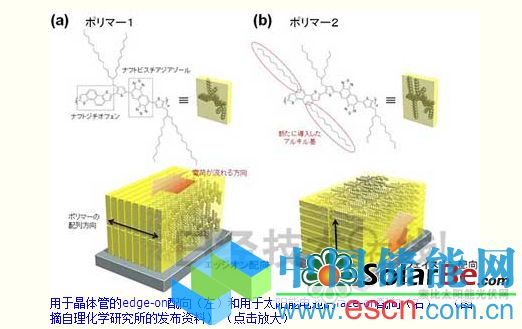 我們并沒有盲目開發(fā)材料。我們在以前用半導體高分子的幾種材料進行研究的過程中,發(fā)現(xiàn)了“如果這樣做的話,配向會變成這樣”的現(xiàn)象,從而最終找出了半導體高分子的配向規(guī)律。這個規(guī)律并不是通過數(shù)值計算導出的,而是憑經(jīng)驗找到的。為了做成face-on而引入烷基也是基于經(jīng)驗。
