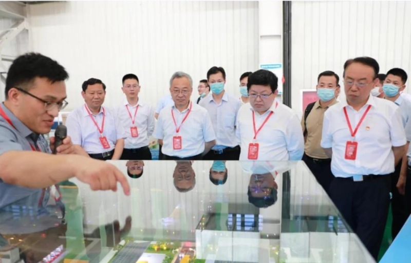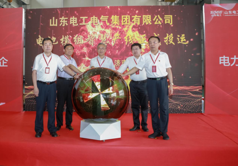 山東省能源局、濟(jì)南高新區(qū)管委會(huì)、濟(jì)南市發(fā)展和改革委、山東省電力行業(yè)協(xié)會(huì)、山東電工電氣等5位領(lǐng)導(dǎo)共同啟動(dòng)電池模組智慧產(chǎn)線。