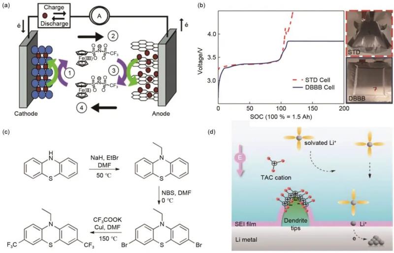 圖12 (a) 二茂鐵基氧化還原穿梭劑機(jī)理示意圖; (b) 在沒有和添加0.4 mol/L DBBB情況下,石墨/C-LFP袋電池的充電電壓曲線; (c) 三步法合成N-乙基-3,7-雙(三氟甲基)吩噻嗪; (d) TAC陽(yáng)離子靜電屏蔽機(jī)理