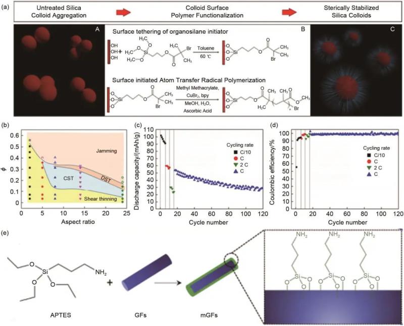 圖9 (a) A為裸露的二氧化硅納米顆粒在溶液中的聚集示意圖,B為有機(jī)硅在二氧化硅膠體表面的附著(上)和通過電子轉(zhuǎn)移原子轉(zhuǎn)移自由基聚合再生的表面引發(fā)催化劑在膠體表面接枝聚甲基丙烯酸甲酯(PMMA)的方案(下),C為通過表面接枝PMMA而穩(wěn)定的二氧化硅納米顆粒示意圖;(b) 含有不同長(zhǎng)徑比和體積分?jǐn)?shù)硅納米棒電池電解液的流變圖;組裝的全電池,NMC|EC/EMC/LiTFSI/33%·AR(5)·SiO2納米棒|石墨,在C/10、1 C、2 C和1 C下循環(huán)時(shí)放電容量圖(c)和庫(kù)侖效率變化圖(d);(e) mGFs制備過程
