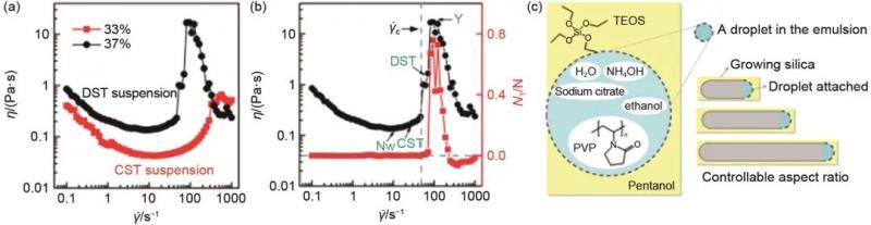 圖7 (a) 不同體積分?jǐn)?shù)下黏度與剪切速率的關(guān)系;(b) 摻雜物質(zhì)量分?jǐn)?shù)為37%的懸濁液的黏度和法向力與剪切速率的關(guān)系;(c)以正硅酸乙酯(TEOS),檸檬酸鈉、聚乙烯吡咯烷酮(PVP)、氫氧化銨、乙醇和戊醇為原料,采用乳液法合成了長(zhǎng)徑比可控的二氧化硅納米棒