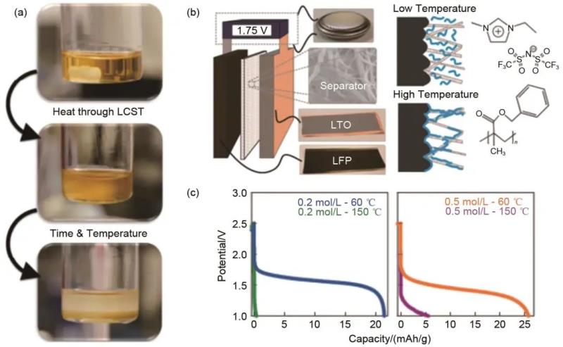 圖4 (a) PEO/IL相分離的照片;(b) 電池組裝示意圖以及聚合物PBMA和離子液體[EMIM][TFSI]的結(jié)構(gòu)和電極表面高溫下的熱響應(yīng)機(jī)制;(c) 以LTO/LFP為電極、5% PBMA和0.2 mol/L/0.5 mol/L LiTFSI/[EMIM][TFSI]組成的電池在60 ℃和150 ℃下的電化學(xué)性能