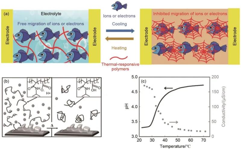 圖3 (a) 通過可逆的熱響應(yīng)聚合物來抑制電極之間的離子或電子傳導(dǎo)以防止電化學(xué)存儲(chǔ)設(shè)備的熱失控;(b) PNcA熱響應(yīng)聚合物電解質(zhì)的圖示(在室溫下,PNcA溶解、質(zhì)子解離;在LCST上方,PNcA發(fā)生相變,并從溶液中結(jié)合離子降低電導(dǎo)率);(c) 在約4.7 ℃/min的升溫速率下,2.2%(質(zhì)量分?jǐn)?shù),下文同)PNcA溶液的pH值和離子電導(dǎo)率對(duì)溫度的響應(yīng)