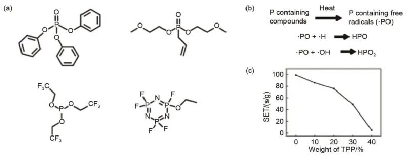 圖2 (a) 阻燃劑的典型分子結(jié)構(gòu);(b) 含磷化合物的阻燃機(jī)理;(c) 商用電解液加入磷酸三苯酯(TPP)后自熄時(shí)間隨TPP質(zhì)量分?jǐn)?shù)增加而顯著降低