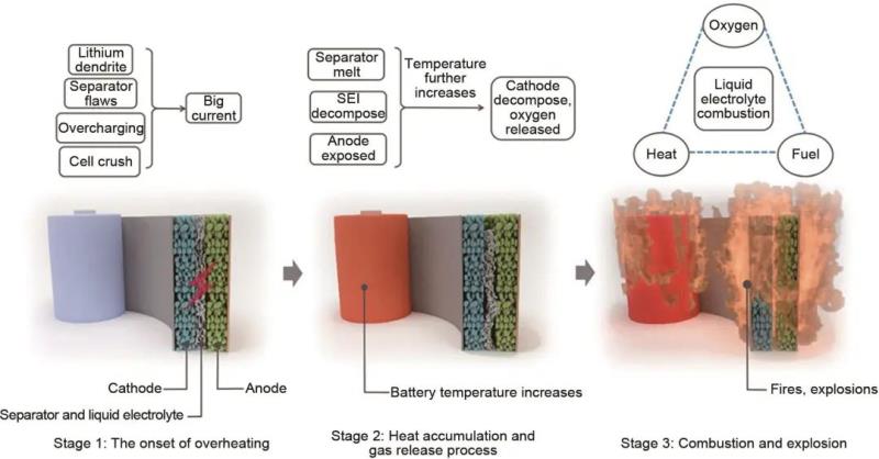 圖1 熱失控過程分為三個(gè)階段。第一階段:過熱出現(xiàn)。電池由正常狀態(tài)變?yōu)楫惓顟B(tài),內(nèi)部溫度開始升高;第二階段:熱量聚集和氣體釋放。電池內(nèi)部溫度迅速上升,并發(fā)生放熱反應(yīng);第三階段:燃燒與爆炸。易燃的電解液會(huì)燃燒,導(dǎo)致火災(zāi)甚至爆炸