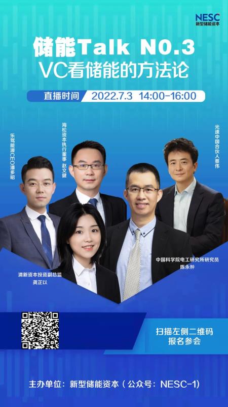 中國儲能網(wǎng)訊:7月3日下午14:00-16:00,我們將邀請清新資本投資副總監(jiān)龔芷以做“VC看儲能的方法論”主題演講,并邀請光速中國合伙人蔡偉、海松資本執(zhí)行董事趙文健、樂駕能源CEO潘多昭和中國化學(xué)與物理電源學(xué)會儲能應(yīng)用分會副秘書長、中科院電工所研究員陳永翀來做對話討論。