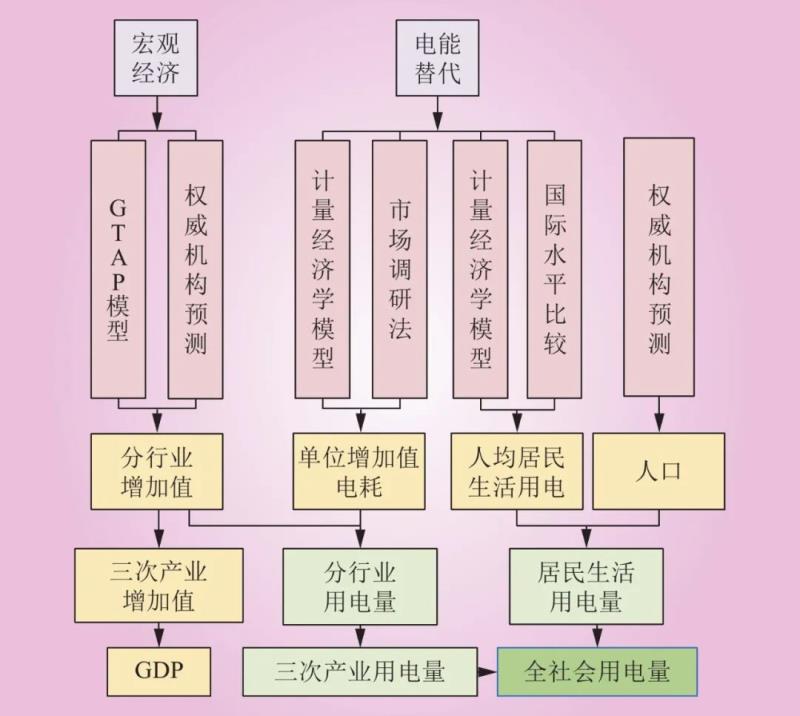 (3)全社會(huì)用電量根據(jù)各部門預(yù)測(cè)結(jié)果匯總?;诜中袠I(yè)用電量,按照行業(yè)屬性求和計(jì)算三次產(chǎn)業(yè)用電量,再結(jié)合居民生活用電量,得到“十四五”期間中國(guó)全社會(huì)用電量預(yù)測(cè)結(jié)果。