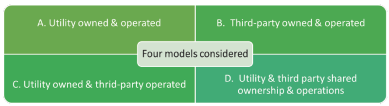 本節(jié)回顧了四種可能的業(yè)務模式,這些業(yè)務模式與儲能系統(tǒng)的所有權有關,目的是儲能系統(tǒng)可以作為配電系統(tǒng)的一種非線纜替代方案(NWA)。這些模型是根據(jù)加拿大儲能協(xié)會的成員意見定義的。加拿大儲能協(xié)會并不認可一種特定的模式,而是探索每種模式的潛在機遇和挑戰(zhàn)。而提出的每個模型可能是相互排斥的,并提供了受監(jiān)管的本地配電公司作為公用事業(yè)公司和儲能開發(fā)商作為第三方的觀點。
