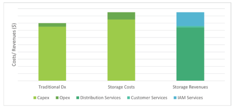 如圖1所示,相對于儲能系統(tǒng)來說,傳統(tǒng)配電設施投資的前期成本可能較低,但如果實現(xiàn)了安大略省獨立電力系統(tǒng)運營商(IESO)管理的批發(fā)市場(IAM)和其他服務的收入抵消,那么儲能資產(chǎn)的凈成本也可能低于傳統(tǒng)配電投資。