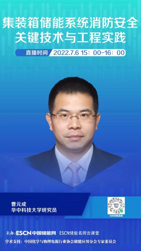 中國儲能網(wǎng)訊:7月6日下午15:00-16:00,中國儲能網(wǎng)邀請華中科技大學(xué)電氣與電子工程學(xué)院電力系、強(qiáng)電磁工程與新技術(shù)國家重點(diǎn)實驗室研究員,博士生導(dǎo)師曹元成教授做客“ESCN儲能名師云課堂”(在線直播),為大家分享《集裝箱儲能系統(tǒng)消防安全關(guān)鍵技術(shù)與工程實踐》主題報告。歡迎業(yè)界同仁在線學(xué)習(xí)與交流。