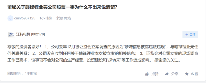 對(duì)此,江特電機(jī)7月4日早盤中在互動(dòng)平臺(tái)表示,公司去年12月被證監(jiān)會(huì)立案調(diào)查的原因?yàn)椤吧嫦有畔⑴哆`法違規(guī)”,與贛鋒鋰業(yè)無(wú)任何關(guān)聯(lián)關(guān)系;公司沒(méi)有收到任何關(guān)于贛鋒鋰業(yè)本次被立案的相關(guān)信息;證監(jiān)會(huì)對(duì)公司立案的現(xiàn)場(chǎng)調(diào)查工作已完畢,該事項(xiàng)不會(huì)對(duì)公司的生產(chǎn)經(jīng)營(yíng)、投資建設(shè)和“探轉(zhuǎn)采”等工作造成影響。