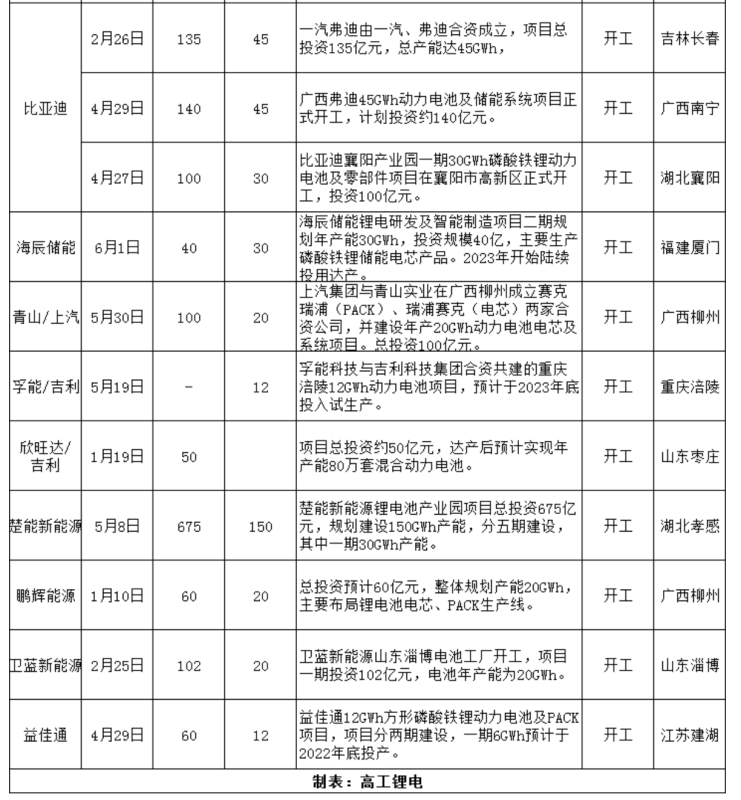 同時(shí),與終端車企合作綁定,電池企業(yè)與整車企業(yè)的合資工廠也在加速啟動,青山與上汽、孚能與吉利、欣旺達(dá)與吉利、比亞迪與一汽的合資工廠均在上半年開工。