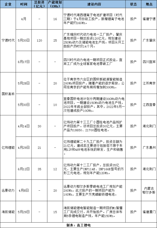 今年上半年,寧德時(shí)代湖西基地、肇慶基地、四川基地相繼投產(chǎn);國軒高科南京、宜春基地陸續(xù)投產(chǎn);億緯鋰能荊門、惠州等多個(gè)工廠也開始產(chǎn)能爬坡;遠(yuǎn)景動力零碳電池工廠投產(chǎn)......